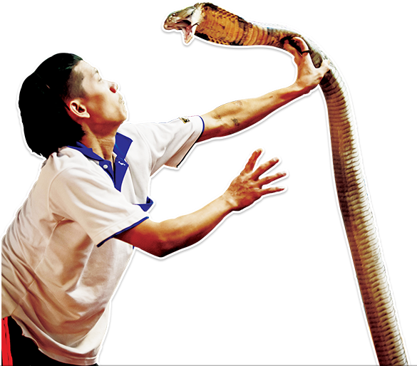 You can see the snake man kiss the deadly poisonous king cobra and the Siamese cobra. Flay the poisonous mangrove snake, and even catch it with his mouth. Show with the very funny copper head racer who can jump up 2 meters. Then you can take picture with a python around your neck. And then you can walk around in our tropical garden and see many different kind of snakes, birds, lizards and jungle cats.